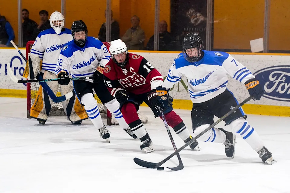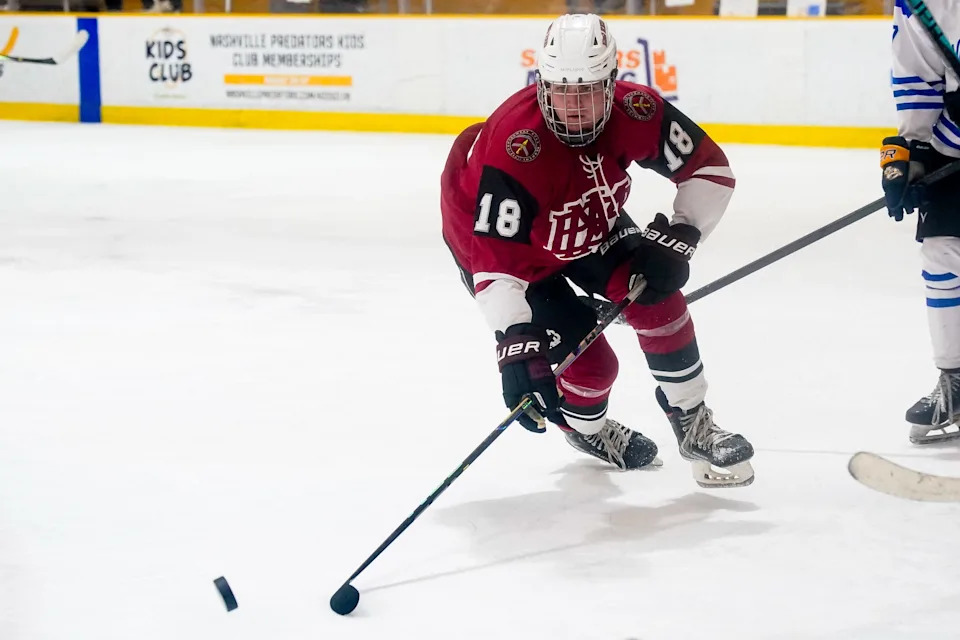 MBA’s Hunter Musser (18) skates with the puck against Nolensville during the third period of a GNASH Predators Cup high school hockey championship game at the Ford Ice Center Bellevue in Nashville, Tenn., Monday, March 2, 2026.