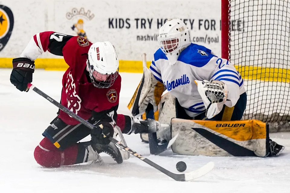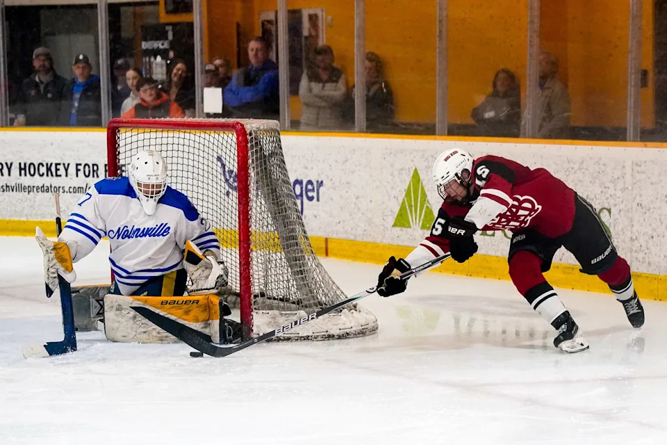 MBA’s Matthew Moore (15) shoots the puck past Nolensville’s Spencer Kern (47) during the first period of a GNASH Predators Cup high school hockey championship game at the Ford Ice Center Bellevue in Nashville, Tenn., Monday, March 2, 2026.