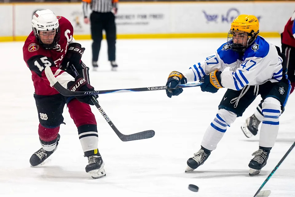 MBA’s Matthew Moore (15) shoots the puck against Nolensville’s Bingston Soundara (27) during the third period of a GNASH Predators Cup high school hockey championship game at the Ford Ice Center Bellevue in Nashville, Tenn., Monday, March 2, 2026.
