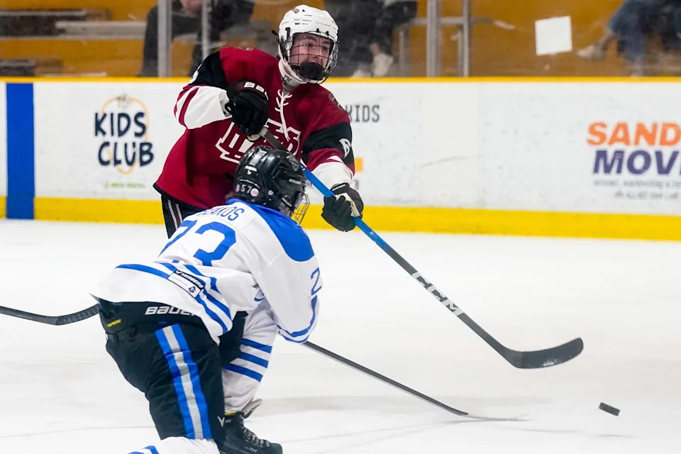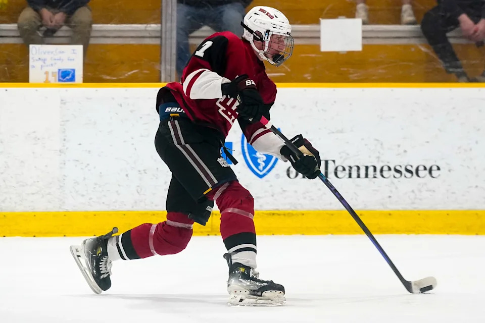 MBA’s Conner Mazzoni (6) shoots the puck scoring a goal against Nolensville during the first period of a GNASH Predators Cup high school hockey championship game at the Ford Ice Center Bellevue in Nashville, Tenn., Monday, March 2, 2026.