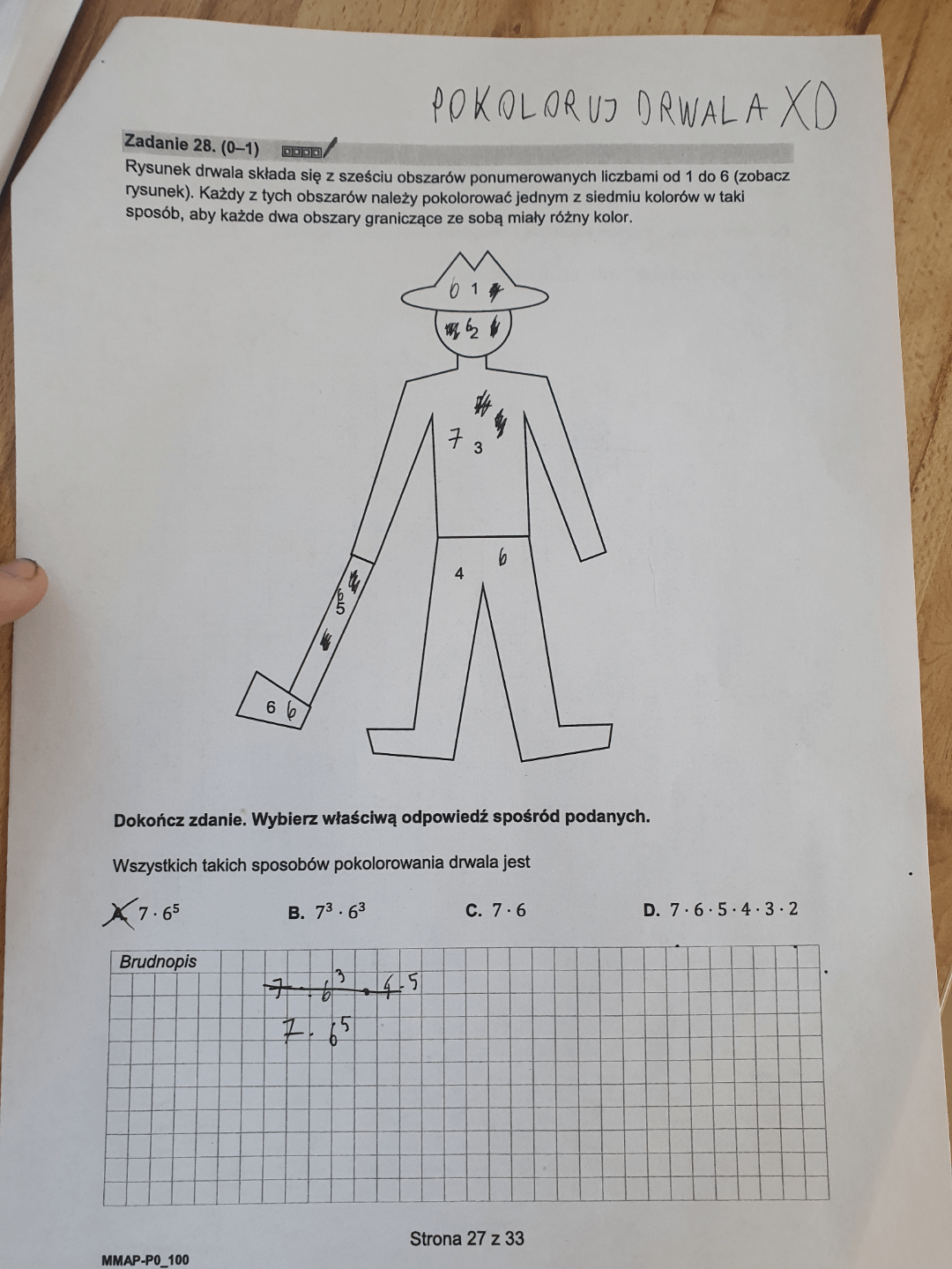 Zdawalam mature jakies 20 lat temu, czy ktos prosze moze mi wytlumaczyc dlaczego tam jest 6^5. Nie wiem skad sie ^5 bierze. Siedem kolorow ma sens, 6 pol ma sens ale skad to ^5?