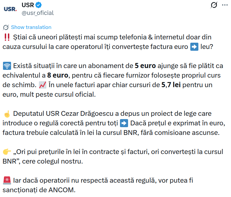 USR deputy Cezar Drăgoescu submitted a bill, if the price is expressed in euros, the invoice must be calculated in lei at the BNR rate, without hidden commissions. “You either put the prices in lei in contracts and invoices, or you convert at the BNR rate”