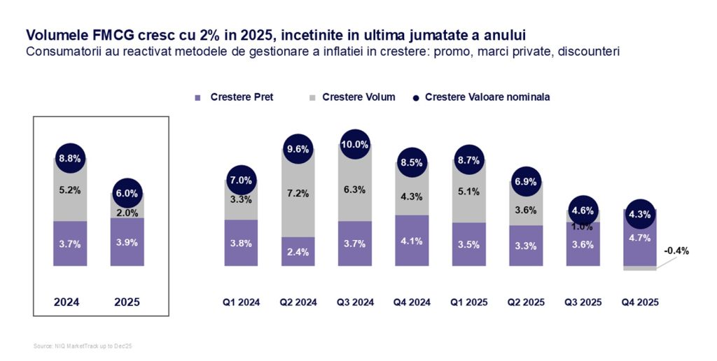 “The FMCG sector started 2025 strongly, but we saw signs of pressure on consumers in the second half of the year,” says Iulia Pencea, general manager of NIQ Romania. “Volumes turned slightly negative (-0.4%) in the fourth quarter of 2025, as higher energy costs, stagnant wages, and VAT increases reduced Romanians’ purchasing power.”