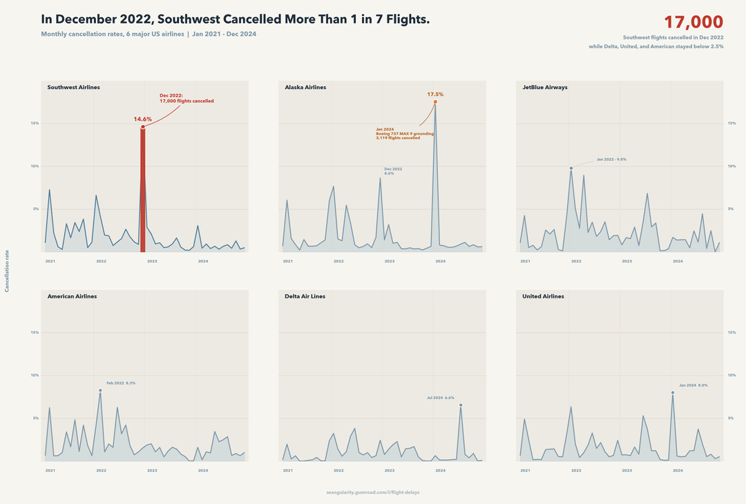Chart 3 – Cancellations: The Southwest December 2022 meltdown hit 14.6% cancellation rate (~17,000 flights) while Delta, United, and American stayed below 2.5% the same month. Southwest’s point-to-point network couldn’t recover from cascading crew misplacements the way hub-and-spoke carriers could. The Alaska January 2024 spike (17.5%) is the 737 MAX 9 grounding after the door plug blowout.
