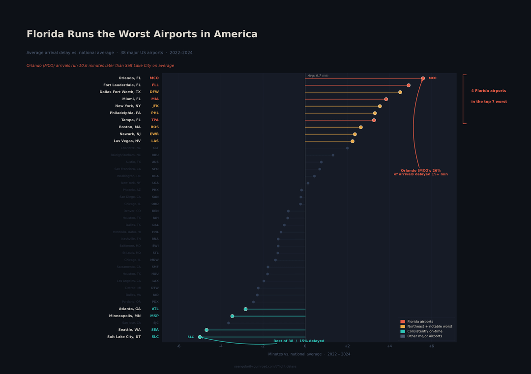 Chart 2 – Florida airports: Orlando (MCO) arrivals run 10.6 minutes later than Salt Lake City on average. 4 of the 7 worst-performing major airports are in Florida. Afternoon thunderstorm season and massive tourist volume on limited infrastructure. Only airports with 50K+ annual departures included.