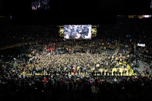 Fans celebrate on the court after Tuesday’s win over Nebraska. Photo courtesy of hawkeyesports.com.