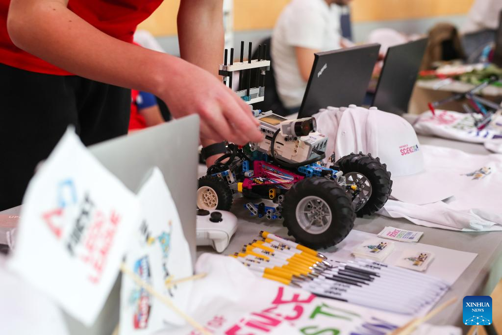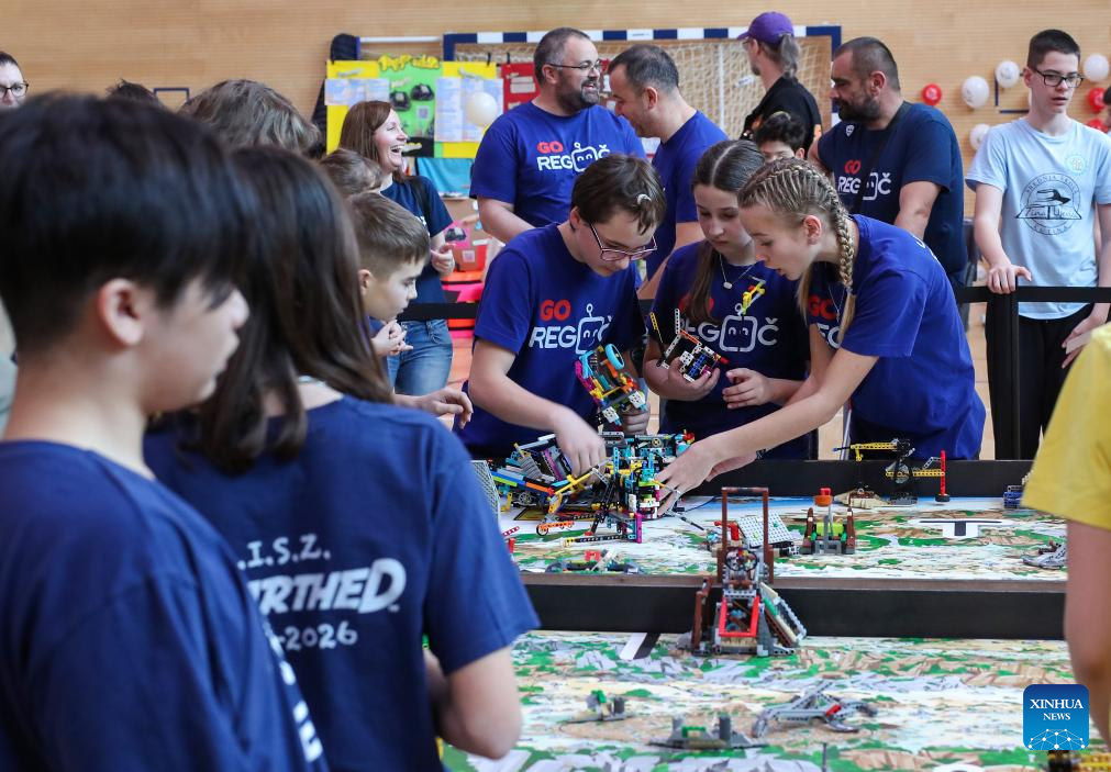 Contestants compete in the FIRST LEGO League competition in Zagreb, Croatia, March 7, 2026. (Zeljko Lukunic/PIXSELL via Xinhua)