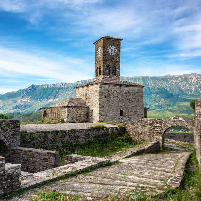 Clock Tower In The Inner Citadel Of Gjirokaster Castle Set Against The Backdrop Of Green Mountains, In The Old Town Of Gjirokaster, Albania, South Eastern EuropeClock Tower In The Inner Citadel Of Gjirokaster Castle Set Against The Backdrop Of Green Mountains, In The Old Town Of Gjirokaster, Albania, South Eastern Europe