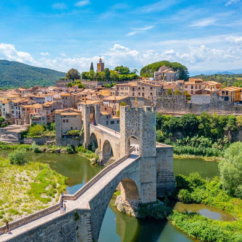 The most iconic monument in Besalú, the zig-zag-shaped Pont Vell, is a seven-arch stone bridge crossing a fast-flowing river, distinguished by its checkpoint-style watchtower in the middle, and breathtaking views.
