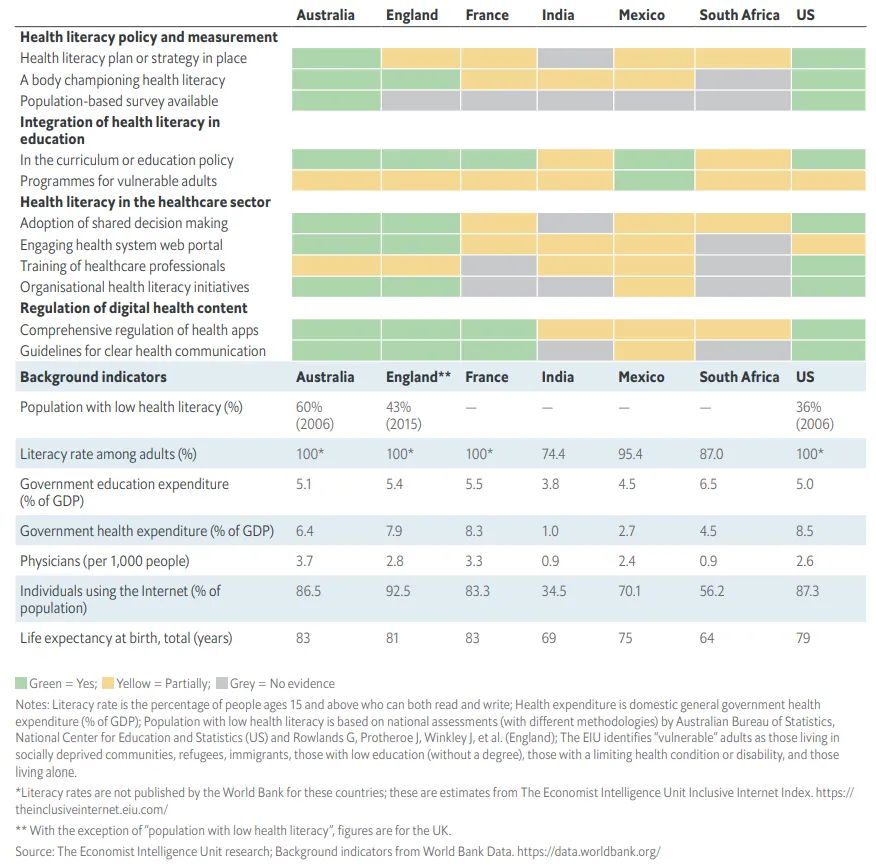 EIU snapshot analysis of health literacy policy and initiatives in seven countries