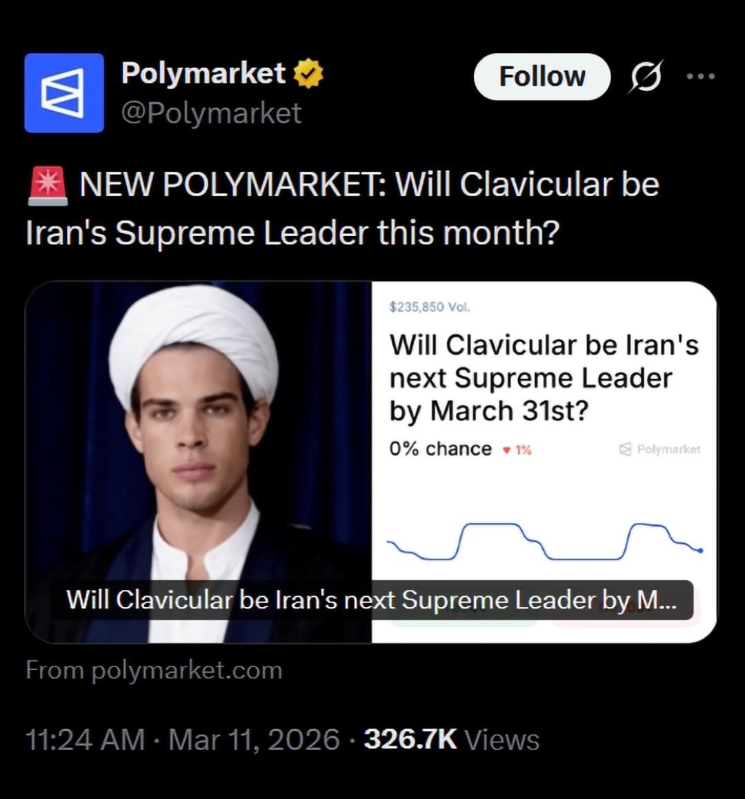 Take, for example, someone at the White House knew about the upcoming assassination. Say the odds of the regime going down was 10%. If the market isn’t liquid, the insider may not want to push the odds higher, increasing the outcome as more predictive. Instead, the insider can withhold the info and bet on oil.