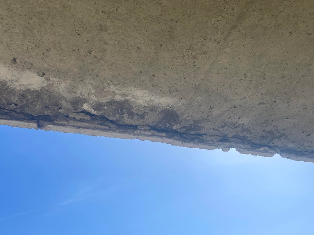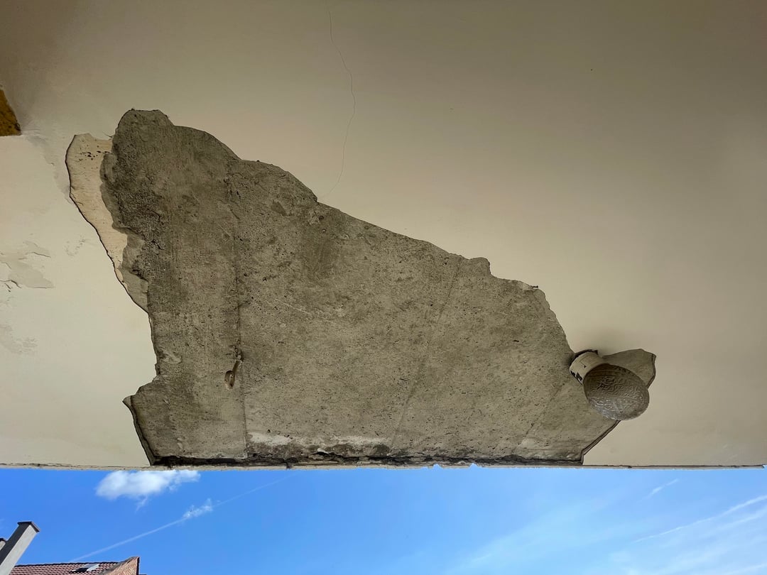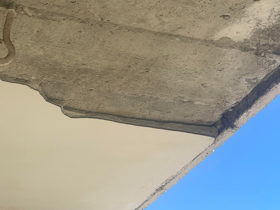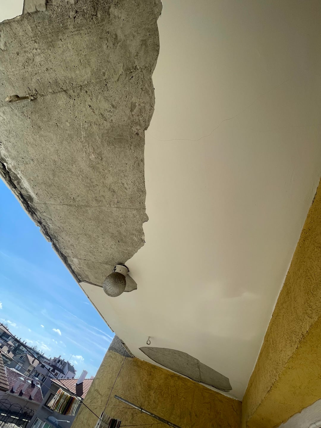 Къртиш всичко абсолютно “до здраво”. Ако е само мазилка, измазваш пак с нещо на варова/циментова основа. Ако се обрушва и бетона и имаш и оголена армировка, репарираш с разтвор на циментова основа предназначен за възстановяване на бетоновото покритие.