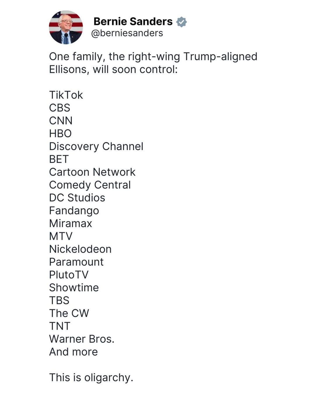 Bernie Sanders: “One family, the right-wing Trump-aligned Ellisons, will soon control: TikTok, CBS, CNN, HBO, Discovery Channel, BET, Cartoon Network, Comedy Central P, DC Studios, Fandango, Miramax, MTV, Nickelodeon,Paramount,PlutoTV,Showtime,TBS,The CW,TNT,Warner Bros and more. This is oligarchy.”