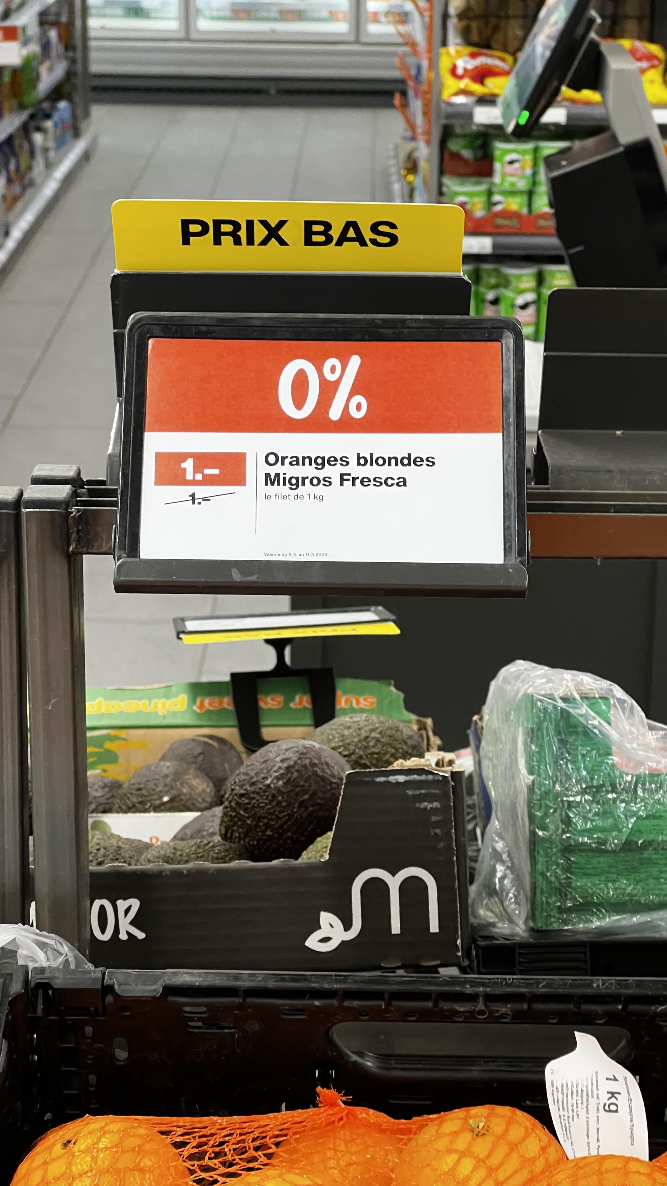gandraw on March 13, 2026 3:56 pm Ok so while the label is obviously an error, you really can’t complain about the price if 1kg of oranges is 1 CHF…