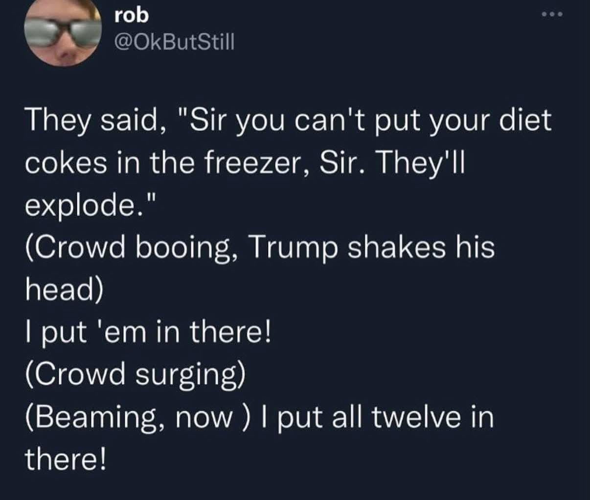If he had actually said this, within a week you’d have right wing pundits talking about how it’s actually a good thing to have frozen diet coke all over the bottom of your freezer.