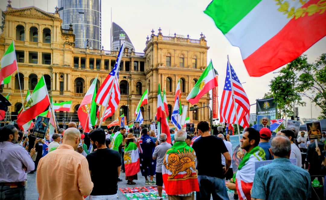 Many Iranians in the diaspora do not support waving Israeli or American flags, particularly given the history of foreign interference in Iran, the division of iran Israel and US are seeking to steal its resources, and the harm caused to innocent civilians, including children.