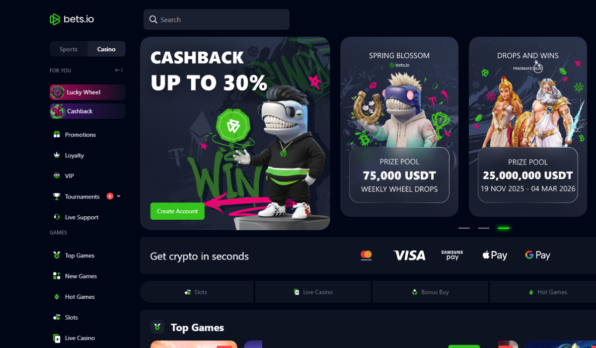 The casino also offers attractive promotions for new players. Users can claim a 225% deposit bonus along with 225 free spins up to 1 BTC, distributed across three stages. Bets.io further enhances the experience with multiple cashback rewards, including 10% cashback on the first day, 10% daily cashback, and 20% weekly cashback.