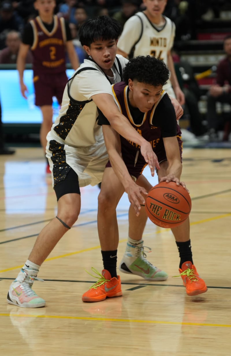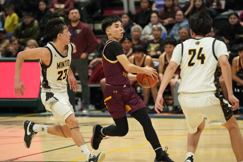 Shaktoolik’s Chase Katchatage tries to maintain possession against a Minto defender during the championship game of the Alaska State 1A Boys Basketball Tournament on Saturday, March 14, 2026 at Alaska Airlines Center. (Chris Bieri / ADN)