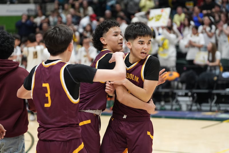 The Shaktoolik boys basketball team celebrates its win against Minto after the championship game of the Alaska State 1A Boys Basketball Tournament on Saturday, March 14, 2026 at Alaska Airlines Center. (Chris Bieri / ADN)