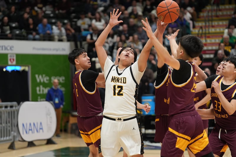 Minto’s Devante Bigfoot Jimmie tries to get a loose ball against the Shaktoolik defense during the championship game of the Alaska State 1A Boys Basketball Tournament on Saturday, March 14, 2026 at Alaska Airlines Center. (Chris Bieri / ADN)