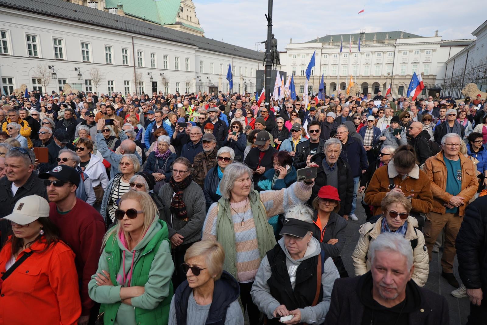 >Former Constitutional Tribunal president Jerzy Stępień also addressed the crowd, drawing parallels with the early years of Polish democracy.
