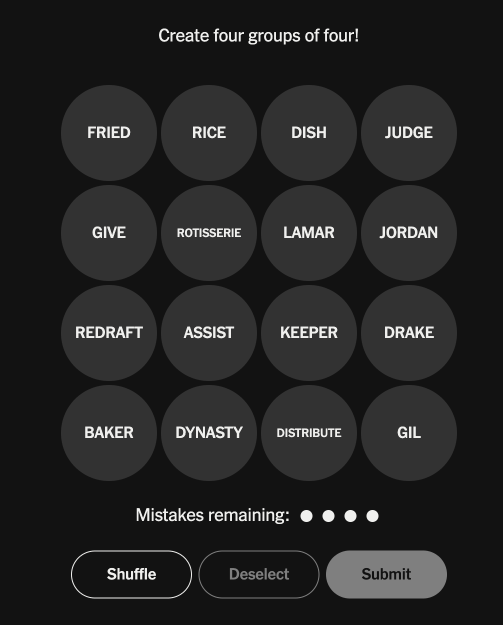 The game’s objective is to group words or objects into four groups of four based on commonalities within each group as quickly as possible. Find the groups without making four mistakes. Each puzzle has exactly one solution, so watch out for words or items that seem to belong to multiple categories!