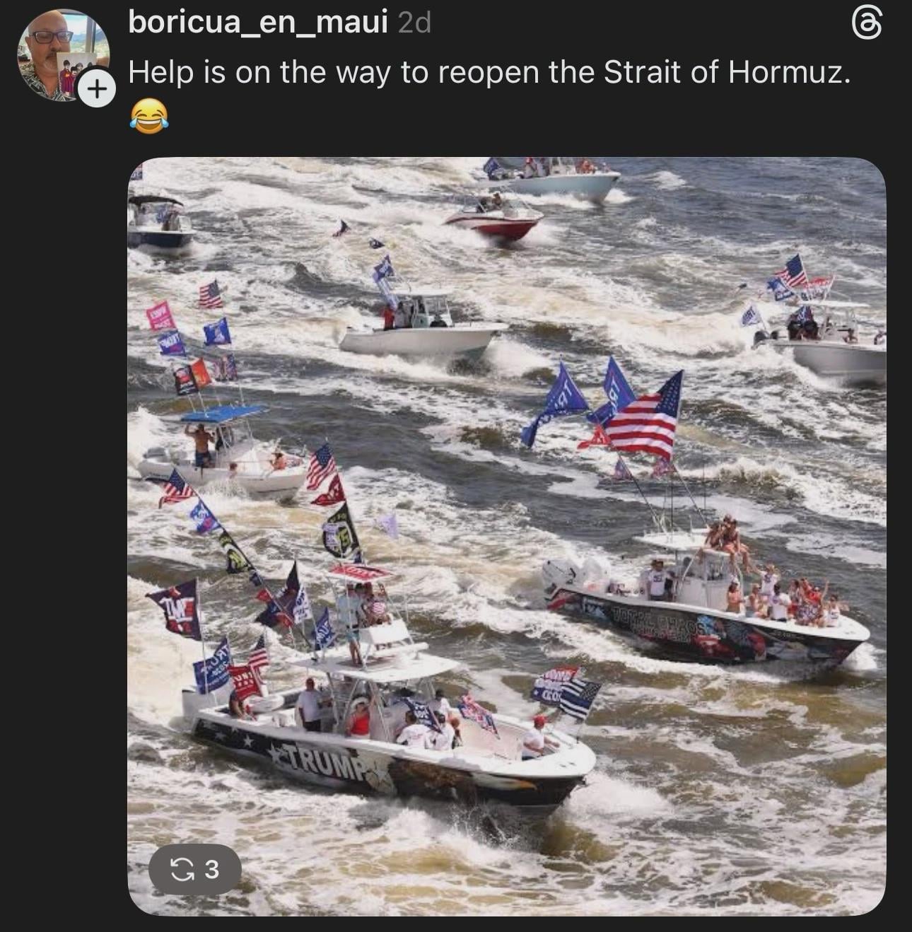 drivebybodypeirce on March 16, 2026 7:37 pm Awe I remember the Trump boat parade when the bigger boats sank the smaller boats. If I didn’t know better I’d think they were trying to do something profound.