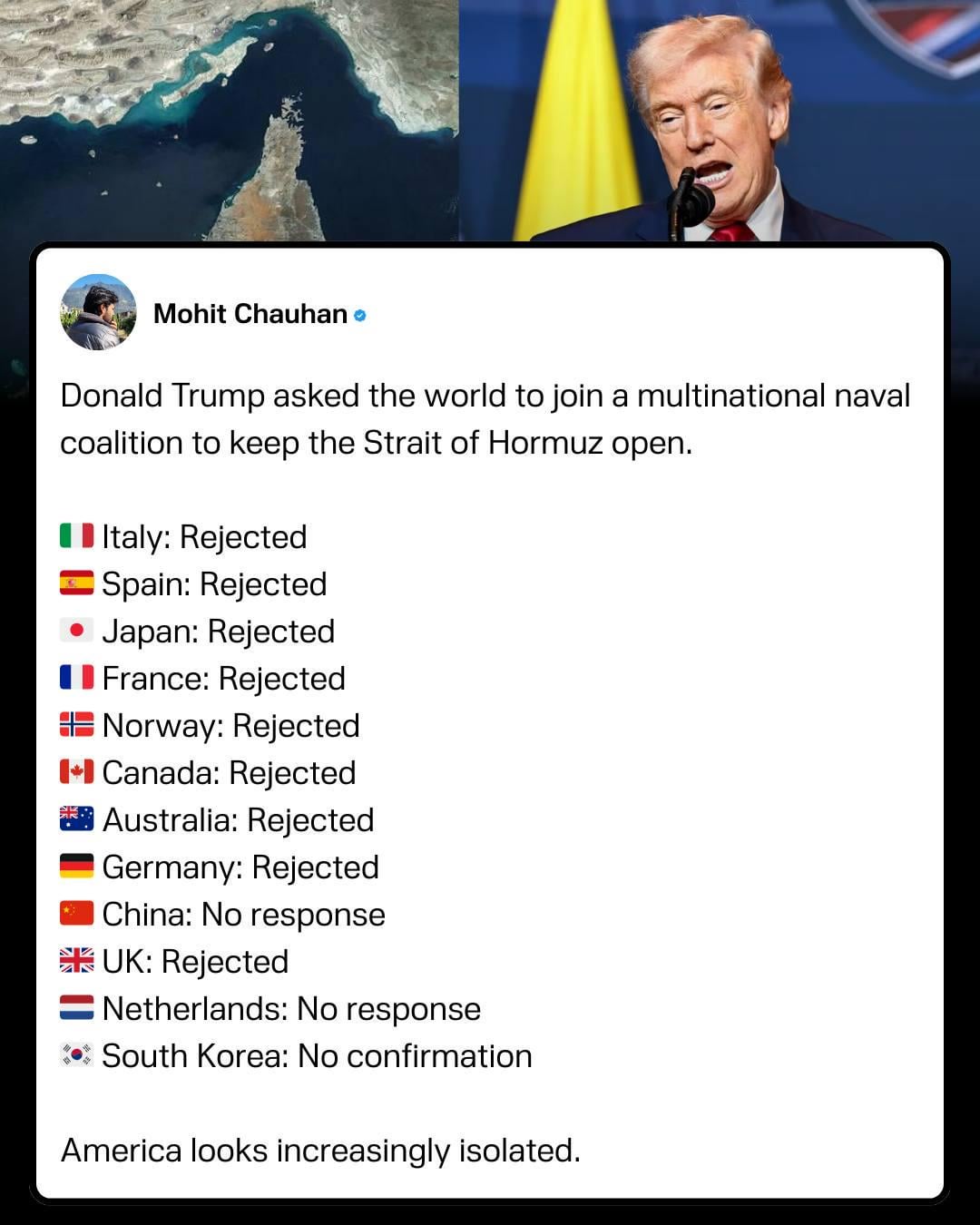 USA má největší flotilu s největším rozpočtem na světě a on bude somrovat u jiných o pomoc… Ještě když tu situaci sám způsobil. Lol.