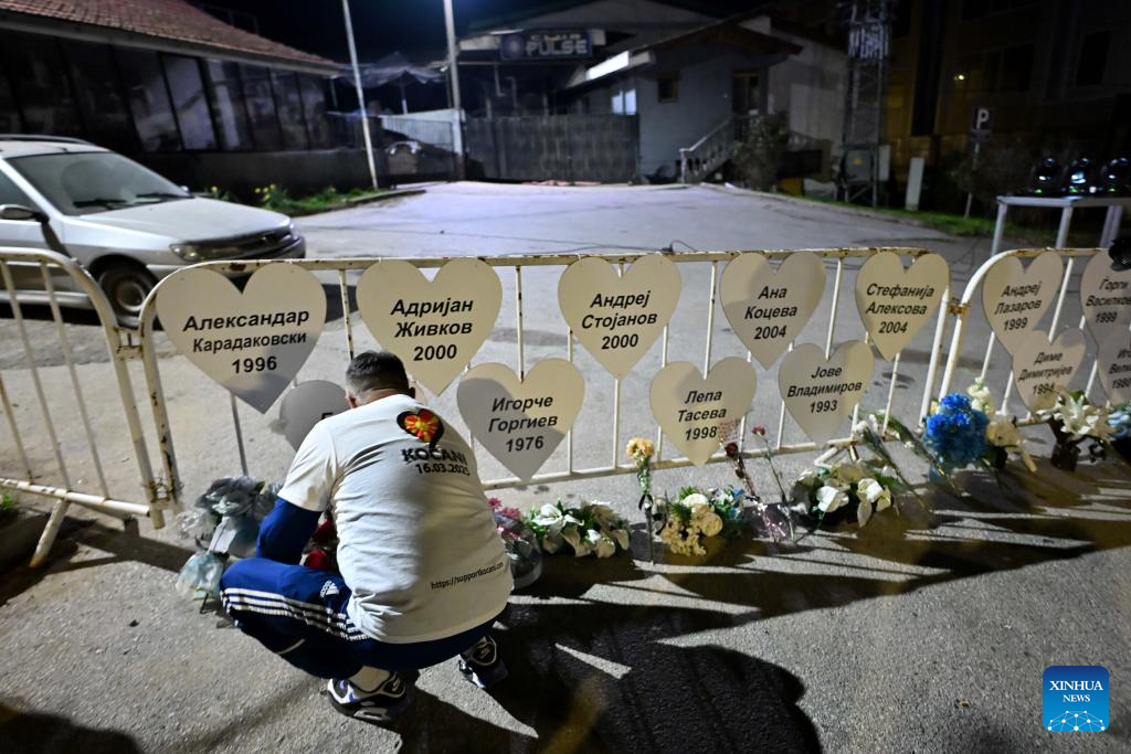 A man lays flowers during a commemoration marking the one-year anniversary of a nightclub fire in Kocani, North Macedonia, March 16, 2026. On March 16, 2025, a nightclub fire claimed the lives of 63 individuals and injured over 100 others. (Photo by Tomislav Georgiev/Xinhua)