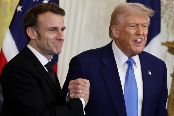 U.S. President Donald Trump and French President Emmanuel Macron shake hands at the conclusion of a joint news conference in the East Room of the White House on Feb. 24, 2025 in Washington, DC. (Image: Chip Somodevilla/Getty Images)