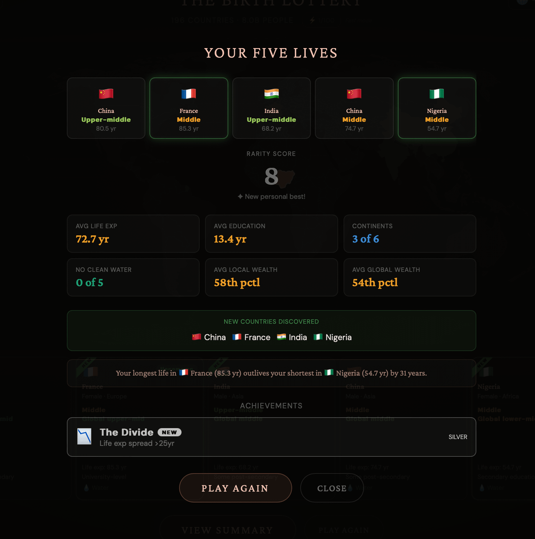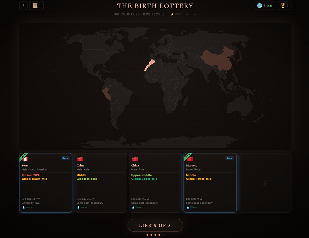 Any privilege (or non privilege) from wealth, education, access to water, and geography based on where you were born are essentially fully random ~1 / 8,000,000,000. I wanted to represent that so I built www.thebirthlottery.com where you can see all those possibilities.