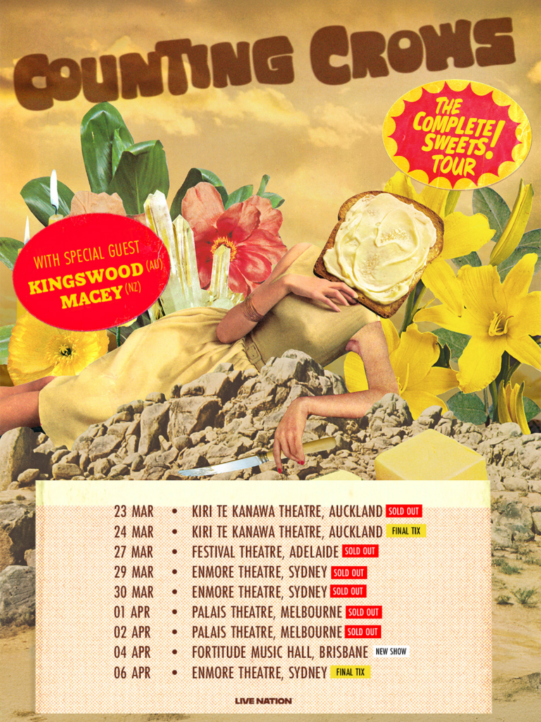 Counting Crows commence The Complete Sweets! Tour in Auckland at Kiri Te Kanawa Theatre on Monday 23 March, followed by Tuesday 24 March, before heading to Australia for a show at Festival Theatre, Adelaide on Friday 27 March, Sydney’s Enmore Theatre on Sunday 29 and Monday 30 March, then heading to Melbourne for shows at Palais Theatre on Wednesday 1 and Thursday 2 April, Brisbane’s Fortitude Music Hall on Saturday 4 April, finally wrapping up in Sydney on Monday 6 April at Enmore Theatre.