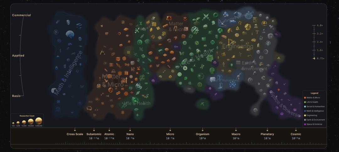 The larger the icon, the more relevant research there is. Most of the research is concentrated at the Nano (nanoscale), Micro (microscopic), and Organism (biological individual) scales, which are exactly the areas where human perception is focused.