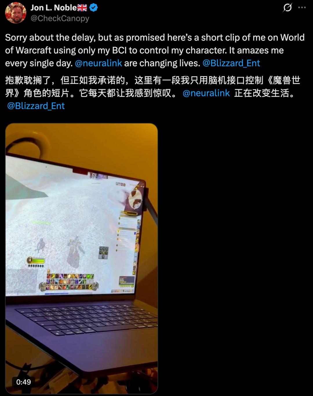 In recent days, a patient who had a Neuralink brain – computer interface implanted posted on X, saying that he can now play World of Warcraft with his thoughts, which sparked another round of public discussion.