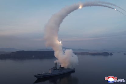 The North Korean destroyer ‘Choe Hyon’ fires missiles during maneuvers in an undisclosed location in the country.KCNA (via REUTERS)