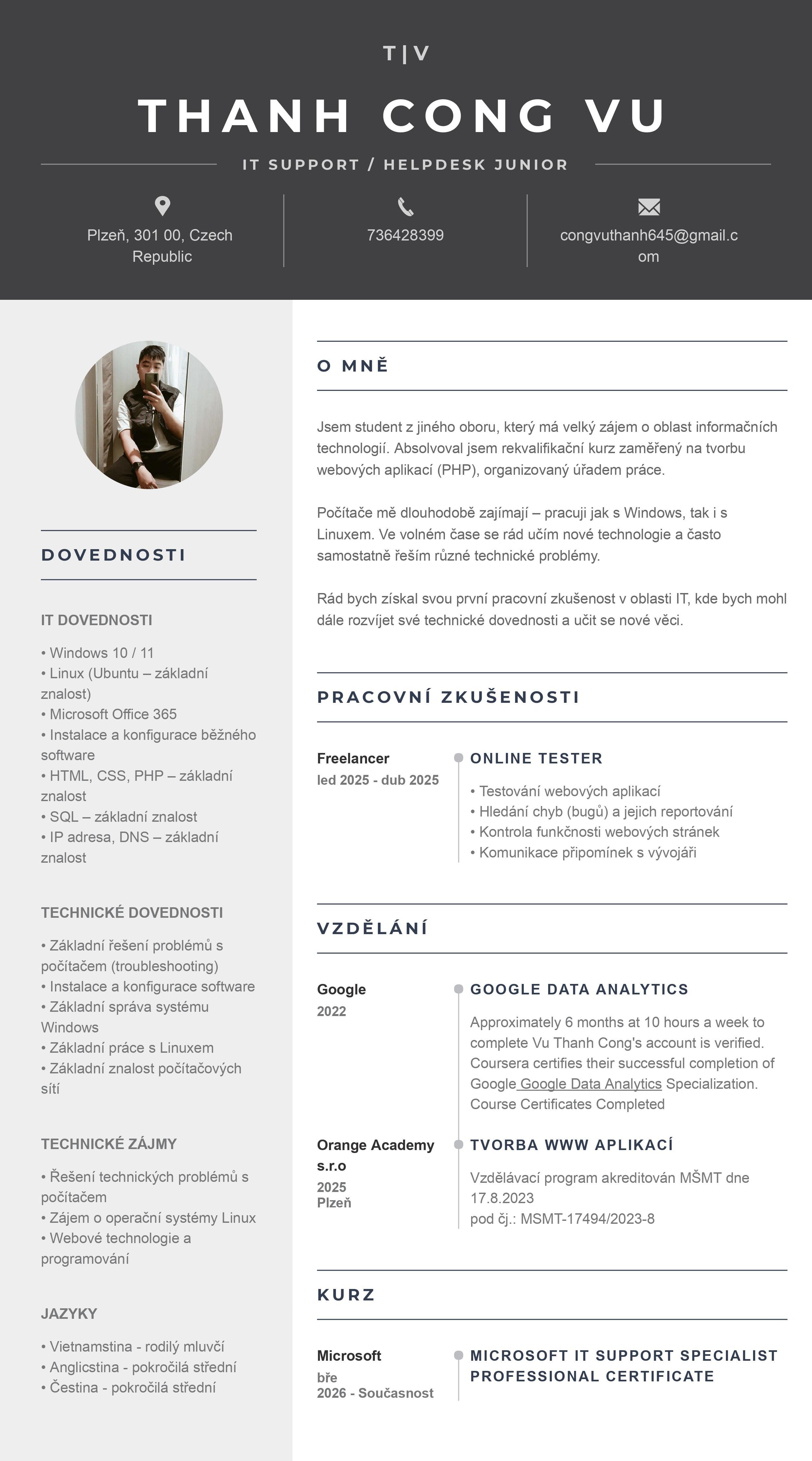 První věc, ani jeden jazyk nemáš napsaný správně… To samo o sobě je red flag už při čtení životopisu. Druhá věc, taková fotka patří na facebook, ne na CV. Třetí věc, co znamená základní znalost IP adresy? Jako že víš co to je? Lepší, když už, by bylo asi nechat jenom IP.