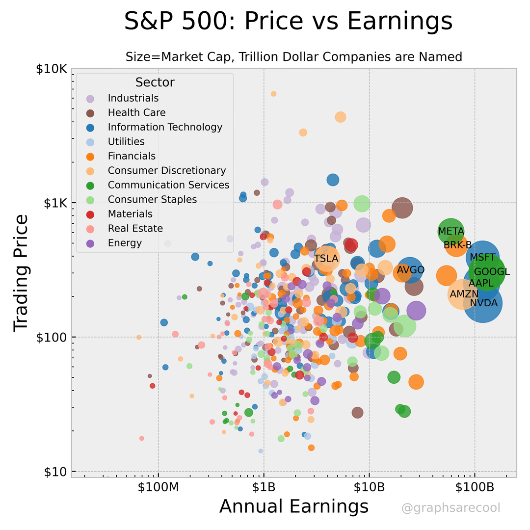 Second slide is all S&P 500 companies plotted by log trading price and log annual earnings. Points are colored by GICS sector and size by total current market cap.