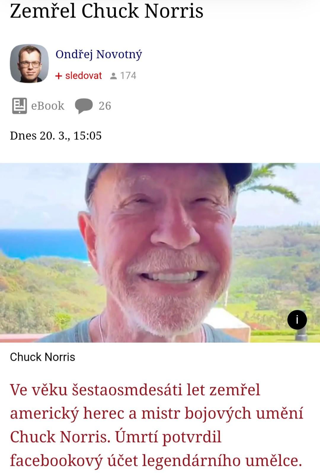 CZ_nitraM on March 20, 2026 2:29 pm RIP, ale tenhle cut vypadá hrozně vtipně Chuck Norris potvrdil vlastní smrt https://preview.redd.it/29ake5i9n7qg1.jpeg?width=1080&format=pjpg&auto=webp&s=cf775e32996bd05832f0f2182ec7cae7b652e556