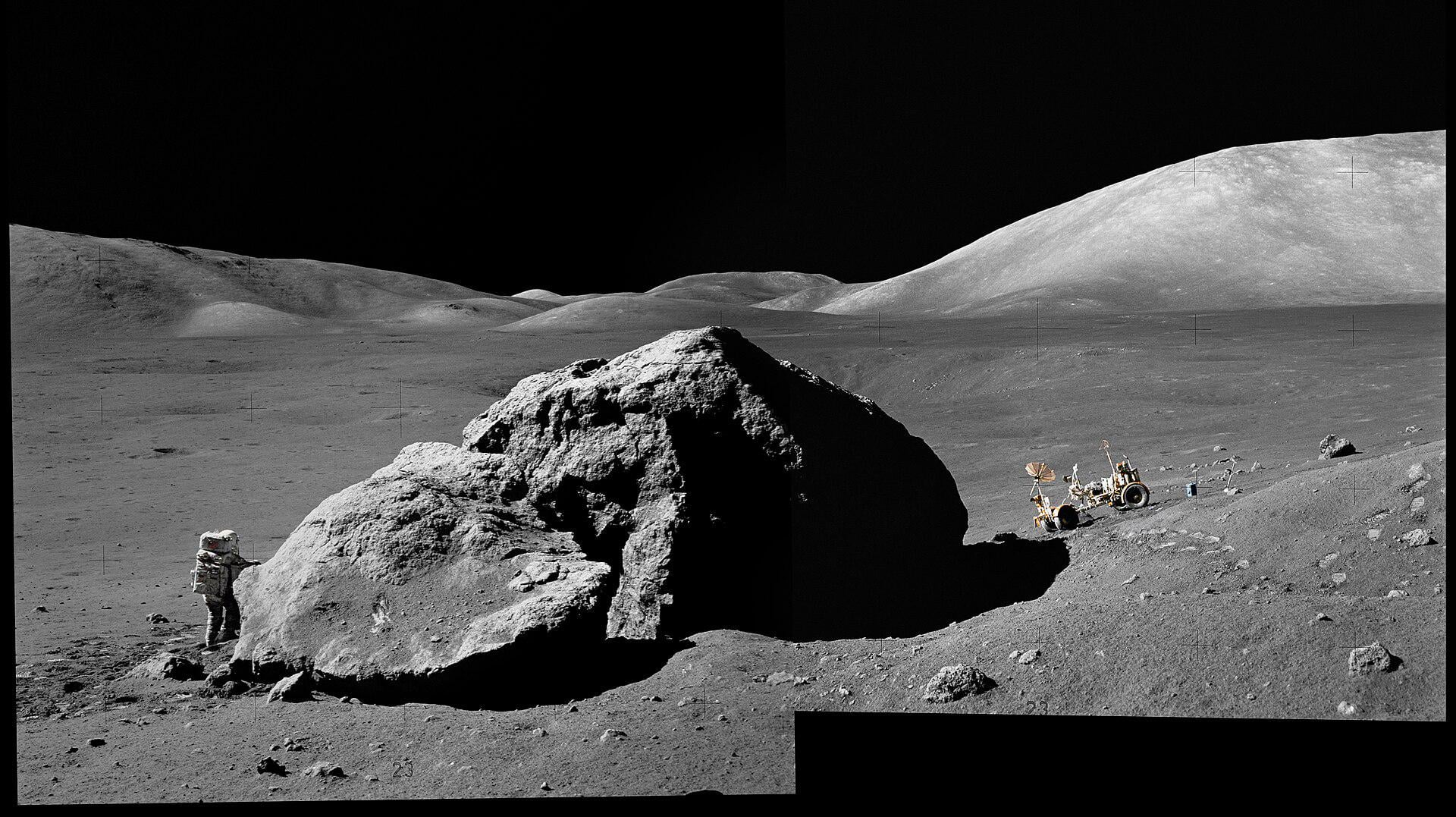 Somehow seeing a rock that size on the moon next to someone with that pitch dark horizon against a grey landscape gives a sense of cosmic horror.