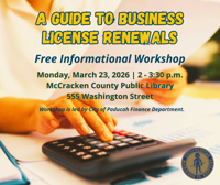 The workshop is titled “Renewal by the Book: A Guide to Business License Renewals,” and will be held Monday, March 23. It will last from 2 p.m., to 3:30 p.m., in the large meeting room on the second floor of the McCracken County Public Library, which is located at 555 Washington Street, in Paducah.
