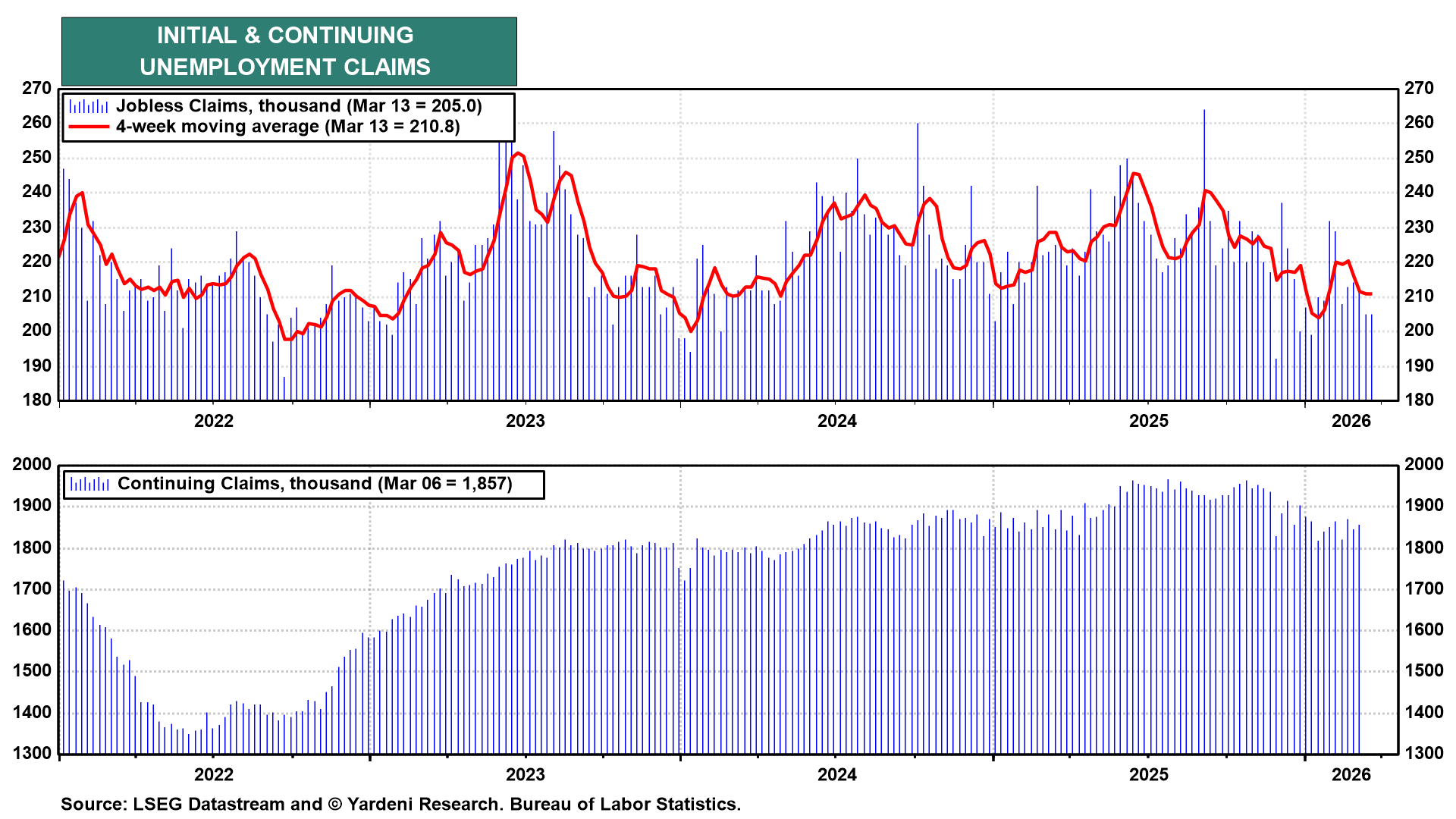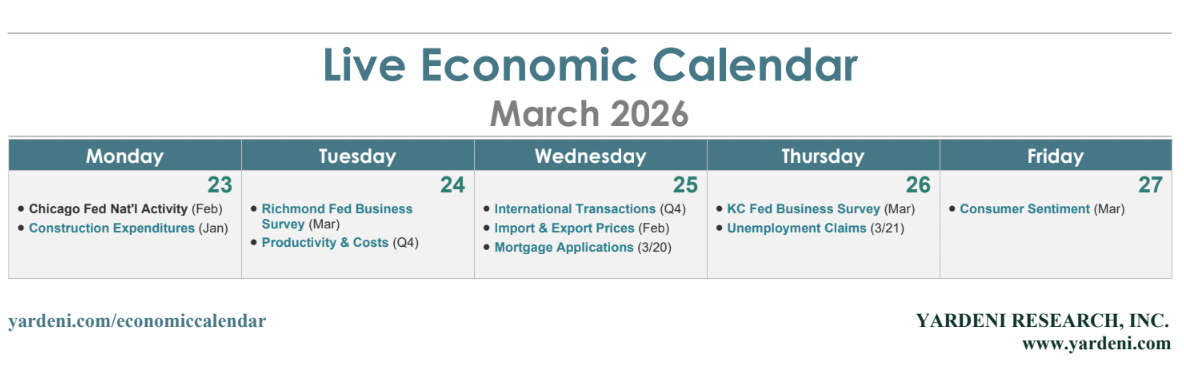 (2) Import/export prices. The February import price data (Wed) follows January’s 0.1% m/m decline (chart). This is a pre-war report, so it won’t reflect the jump in commodity prices during March. Q4 productivity and labor cost data (Tue) should confirm that both were disinflationary last year. We expect to see more of that in 2026.