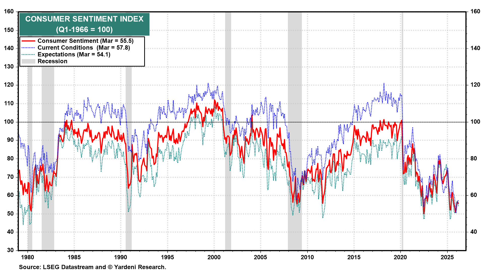 (1) Consumer sentiment. The University of Michigan will report its final March consumer sentiment index (Fri). The previous reading showed sentiment falling to 55.5 from 56.6 (chart). This week’s update should show that surging gas prices are unnerving households around the country.