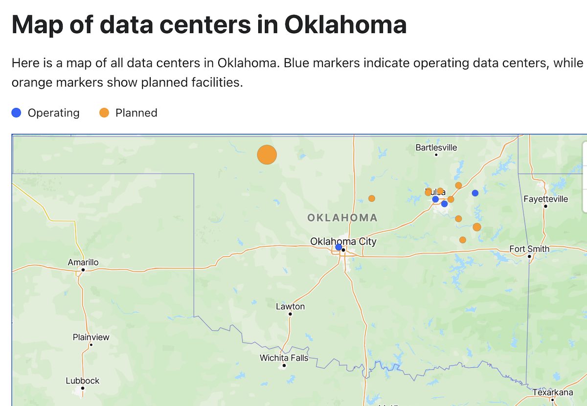 A map created by Clearview.co shows current and planned data centers across Oklahoma as of Sunday, March 22, 2026. (Screenshot)