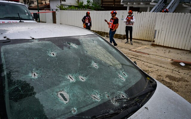 Israeli security and rescue forces at the scene where a missile fired from Lebanon toward Israel caused damage in the northern Israeli city of Kiryat Shmona, March 23, 2026. (Michael Giladi/Flash90)