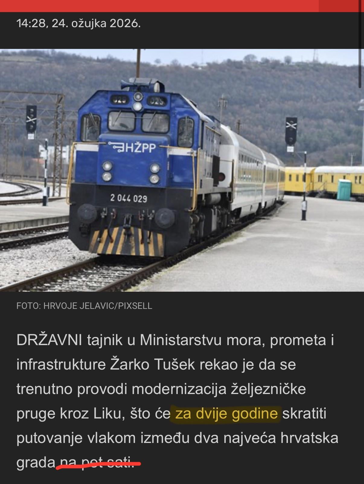 Jel to onaj vlak koji je vozia 6:30 sati (na papiru) pa su pompozno najavili novi vlak al su izostavili da će vozit 8+ sati, pa će godinama nakon pompozno najaviti još noviji vlak koji će vozit uru vrimena brže od originalnog??