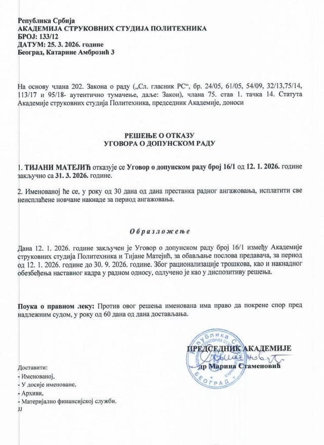 Ugovor o dounskom radu postoji? Dakle nije dobila otkaz već više neće raditi dopunski?