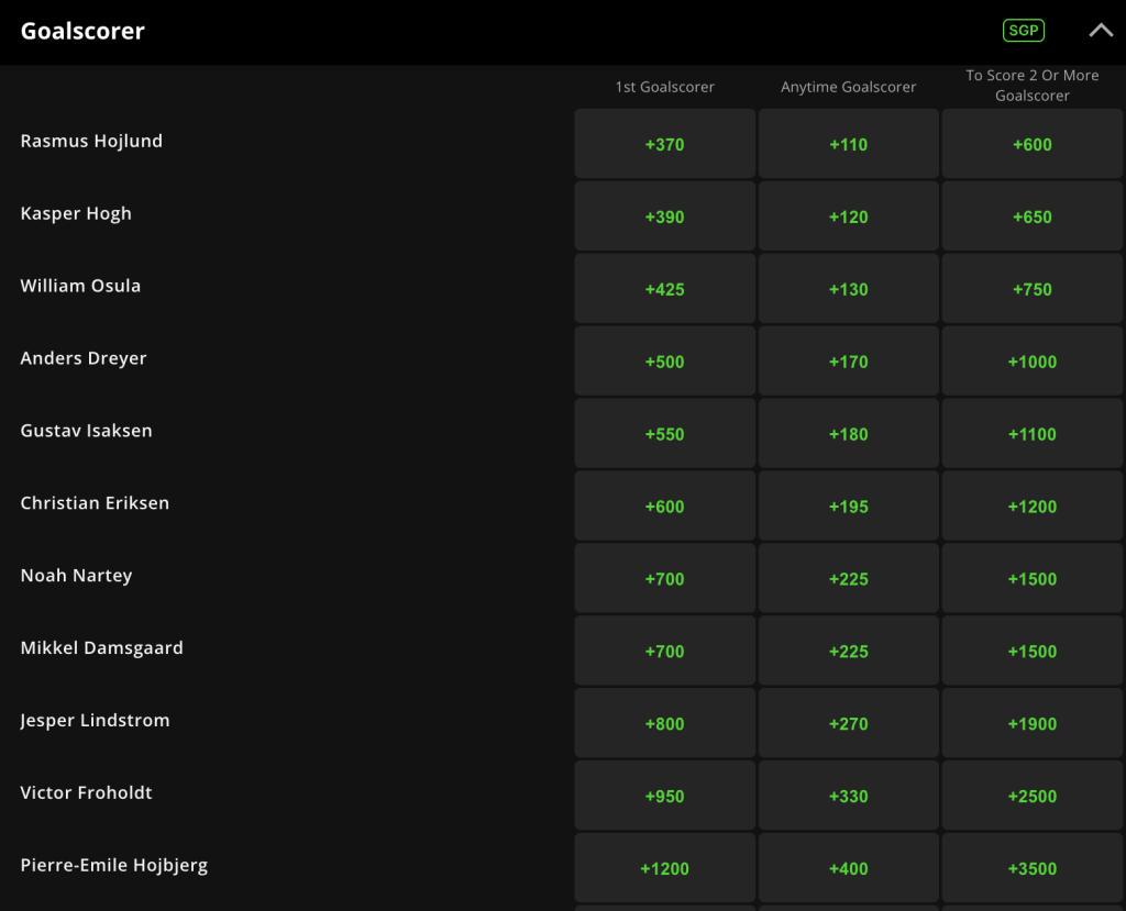 As a near four-to-one favorite to win, odds are very good that Team Denmark will be doing the majority of the goal-scoring. But the real question is, who gets there first? Here’s a look at the top odds for individual goalscorers: