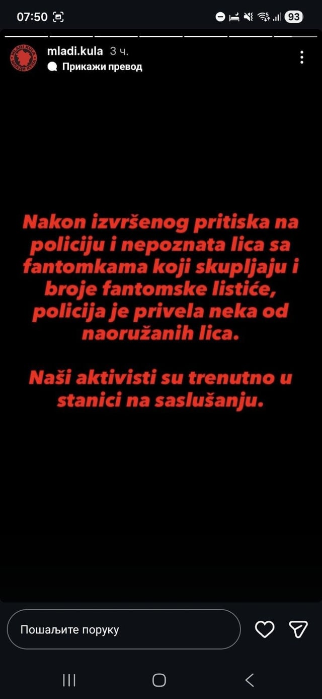 2. Malopre sam slusao devojku koja se ukljucila uzivo na tv. Kaze da su preko noci aktiviste studentske liste jurili na nekom putu kod Kule i saterali ih pored puta, izasli sa motkama itd. i u jednom trenutku se cuo pucanj. Ne zna ko je pucao i sta se desilo ali pozvali su policiju koja je dosla ali nisu hteli da ih legitimisu niti privedu. Na kraju su ih valjda ipak odveli u stanicu i sad su svi tamo daju izjave, i studenti i ovi njihovi. Kaze da su u razgovoru sa tim likovima koji su nosili fantomke sve vreme culi da su placeni da cuvaju bilborde i banere. Takodje kad su izasli iz kola predstavili su se kao policija. Imaju neki snimci ali ne znam gde mogu da se vide.