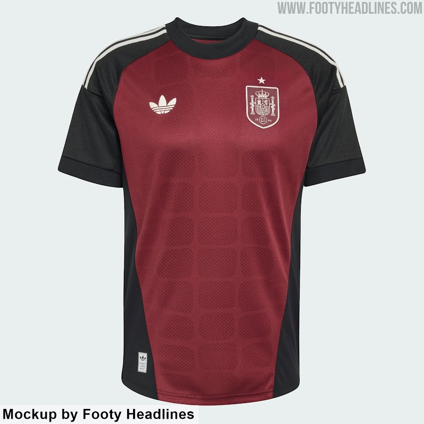 - Design Details: The goalkeeper uniform features a dark maroon torso, black sleeves and side panels, and classic white Adidas Trefoil logo, paired with a monochrome white Spain crest.