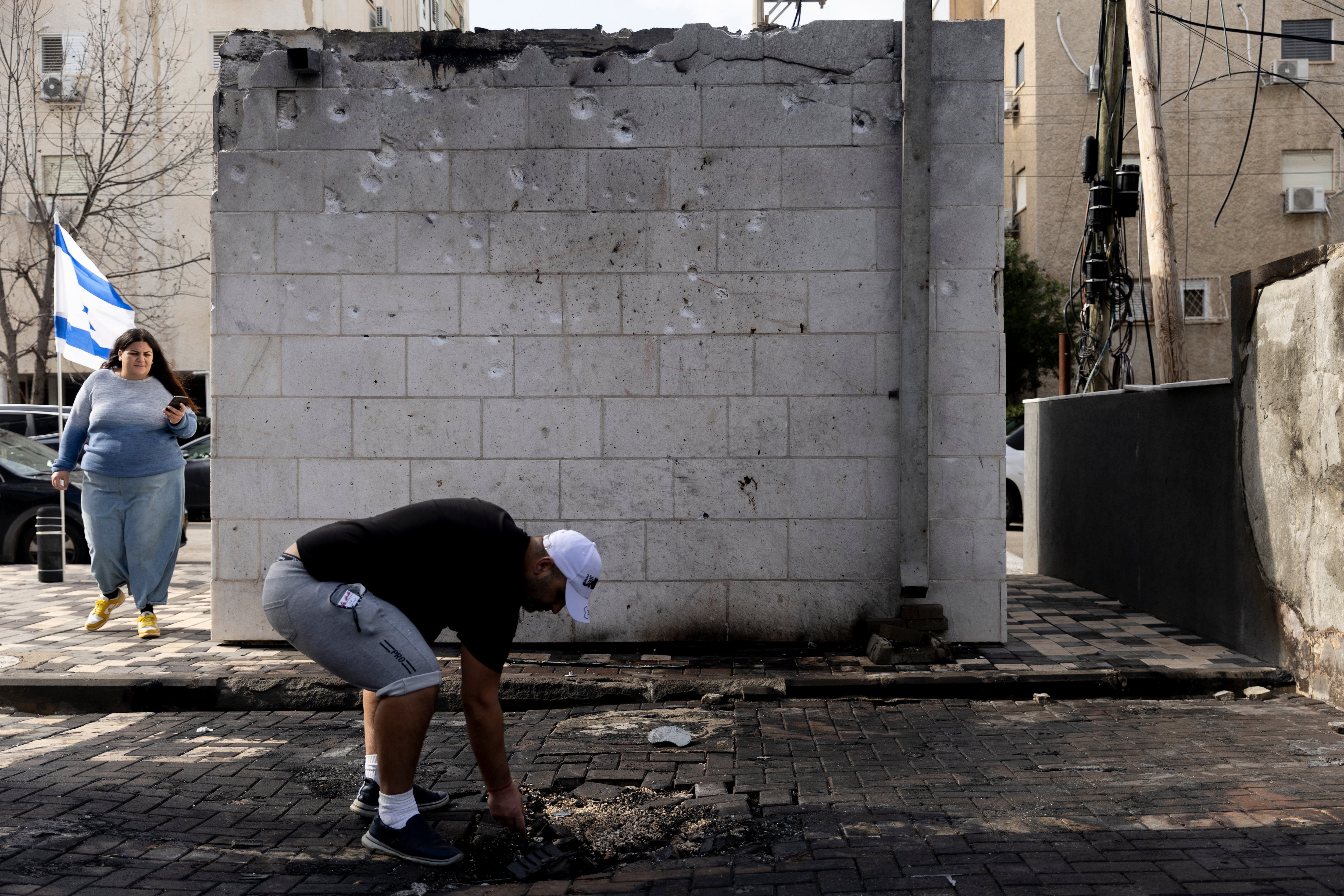 People inspect the impact of a rocket strike from the previous day, leaving one man dead and one seriously injured, in Nahariya, Israel, on March 27, 2026, (Amir Levy/Getty Images)